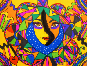Le visage central incarne la femme guerrière, non pas dans un sens de combat extérieur, mais dans une dimension intérieure.